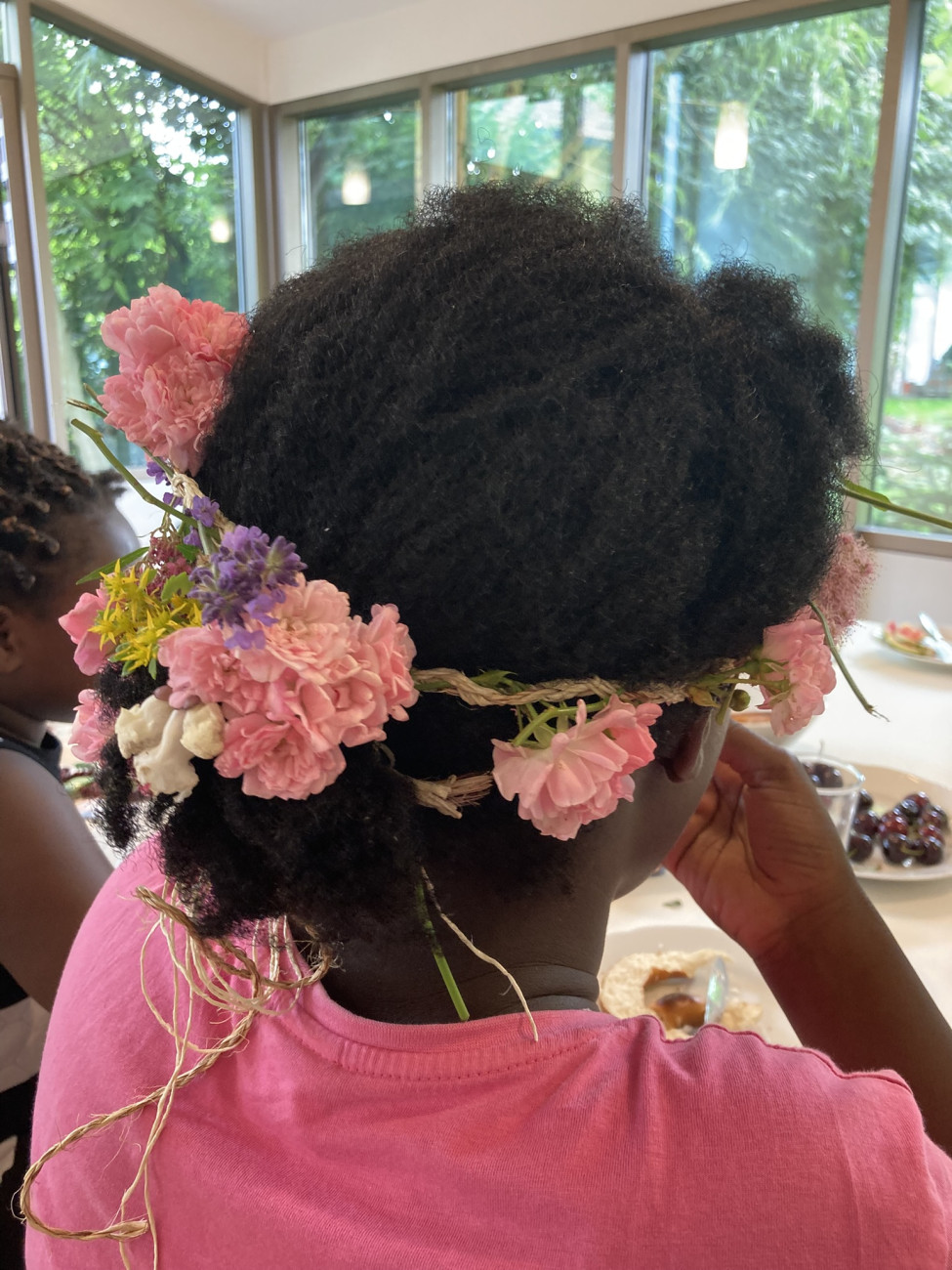 Beim Blütennachmittag im Juni haben die Kinder zunächst Kordeln geflochen, was gar nicht so leicht war. Aber die Mühe hat sich gelohnt, denn nun wurden die Kordelstränge mit Blüten bestückt und es sind schöne Blütenschmuckwerke entstanden.