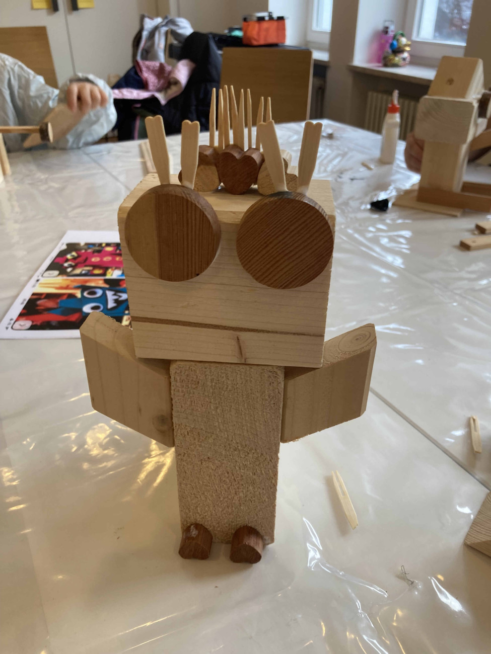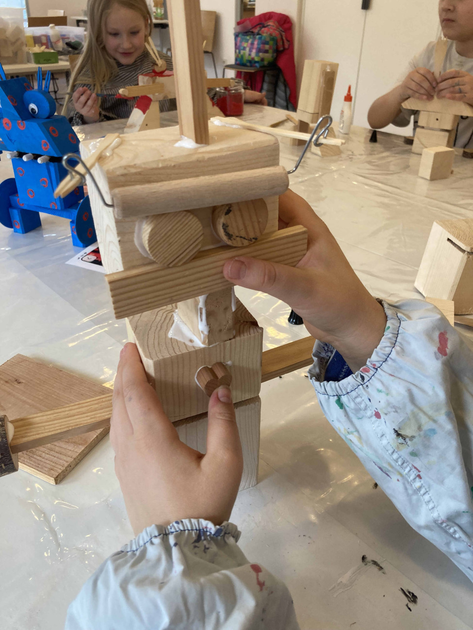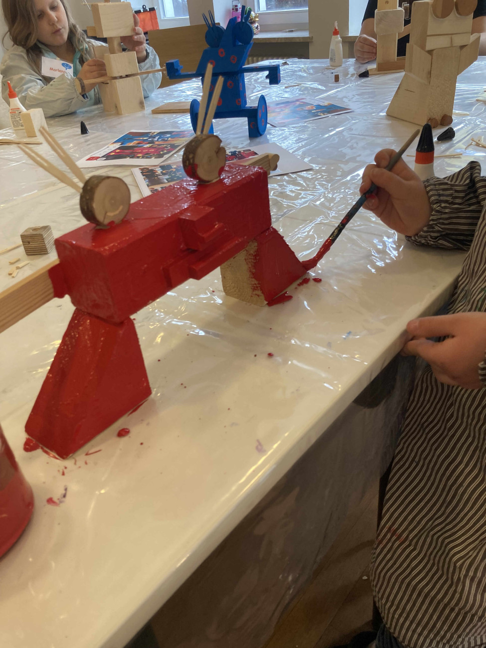 Beim Faschingstreff gestalteten die Kinder aus Holzresten fantasievolle Monster, Prinzessinnen und Roboter. Es wurde konstruiert, gemalt und verziert. Die Kunstwerke finden bestimmt einen tollen Platz im Kinderzimmer.