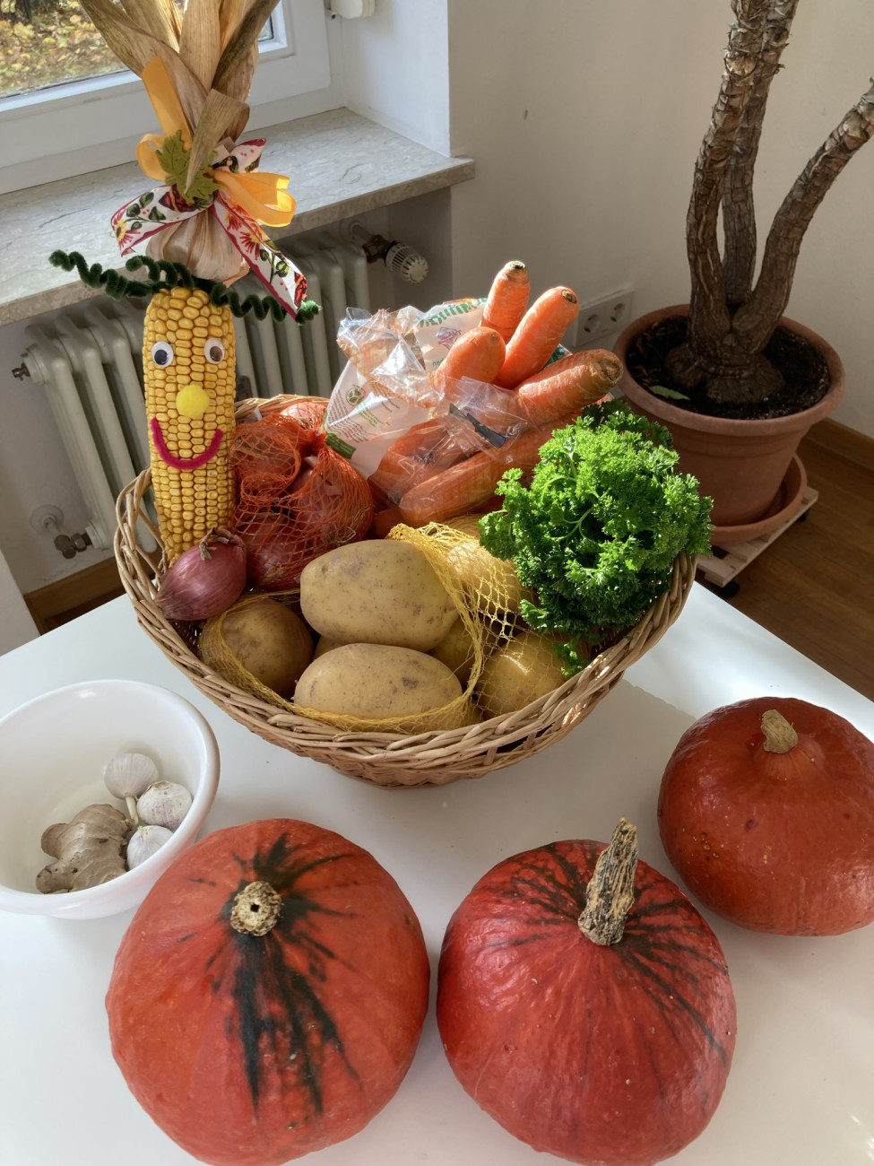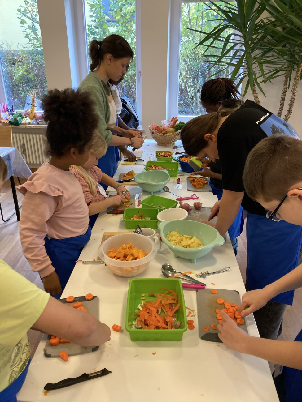 Die Kinder hatten die Gelegenheit verschiedene Schneide- und Schältechniken auszuprobieren und die Töpfe füllten sich schnell mit Kürbis, Kartoffeln, Karotten und Co. Es wurden Knusperstangen mit verschiedenen Saaten gebacken, die zusammen mit der Kürbissuppe besonders lecker schmeckten.