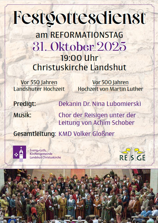 1475 – 1525 – 2025: Im Reformationsgottesdienst am 31.10.25, um 19.00 Uhr in der Christuskirche Landshut, werden zwei Jubiläen gefeiert: 550 Jahre Landshuter Hochzeit und 500 Jahre Hochzeit Martin Luthers mit Katharina von Bora.