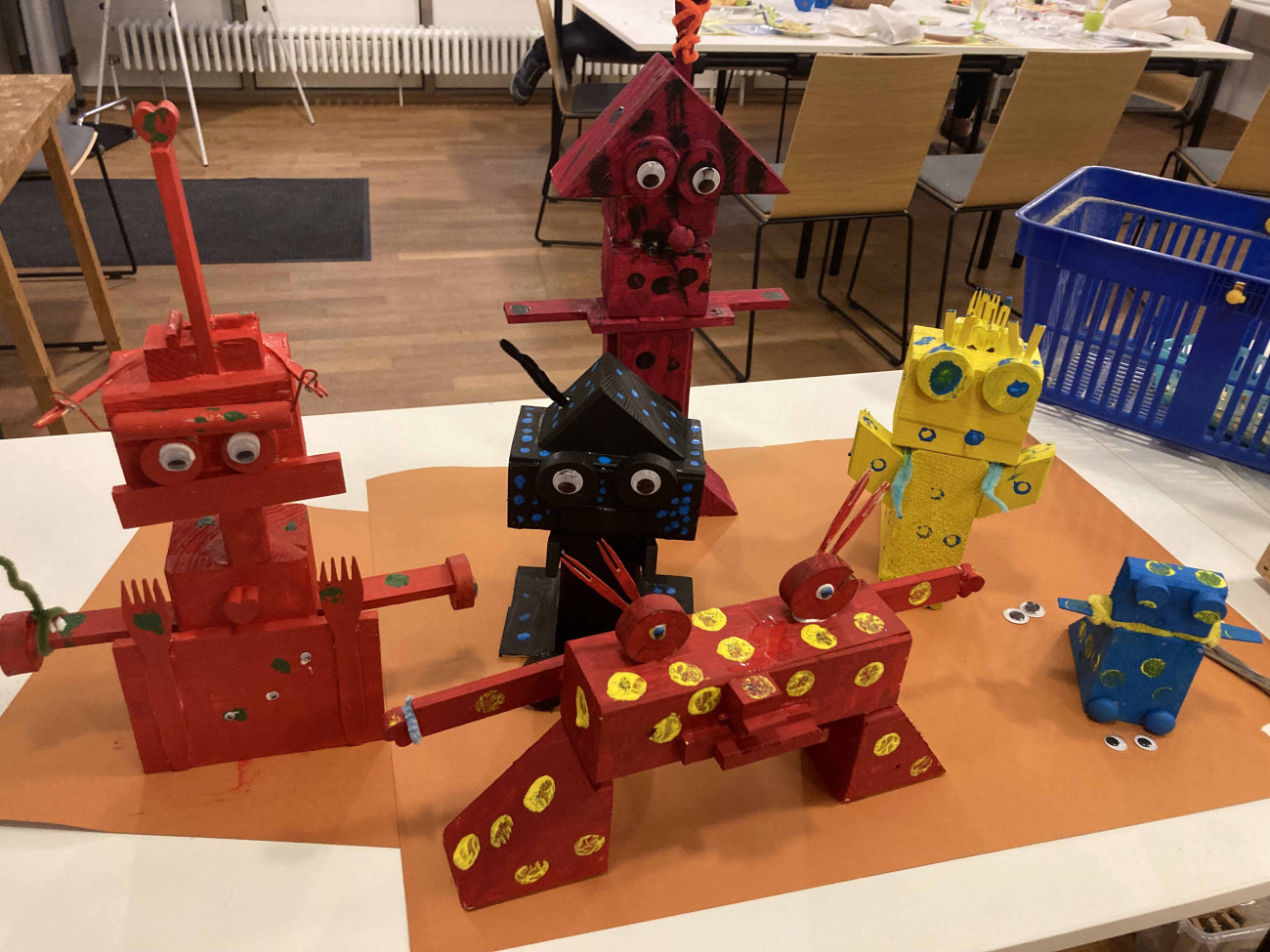 Beim Faschingstreff gestalteten die Kinder aus Holzresten fantasievolle Monster, Prinzessinnen und Roboter. Es wurde konstruiert, gemalt und verziert. Die Kunstwerke finden bestimmt einen tollen Platz im Kinderzimmer.