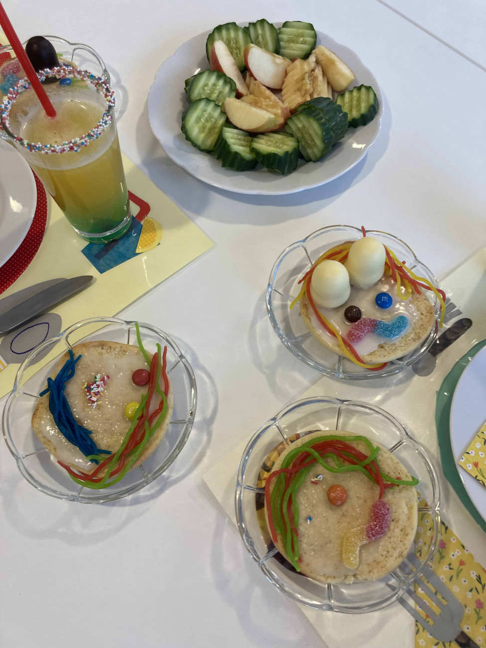 Und es wurden noch mehr lustige Gestalten dekoriert. Aus einfachem Gebäck wurden mit etwas Fantasie und klebrigen Süßigkeiten lustige Clowngesichter - lecker!
