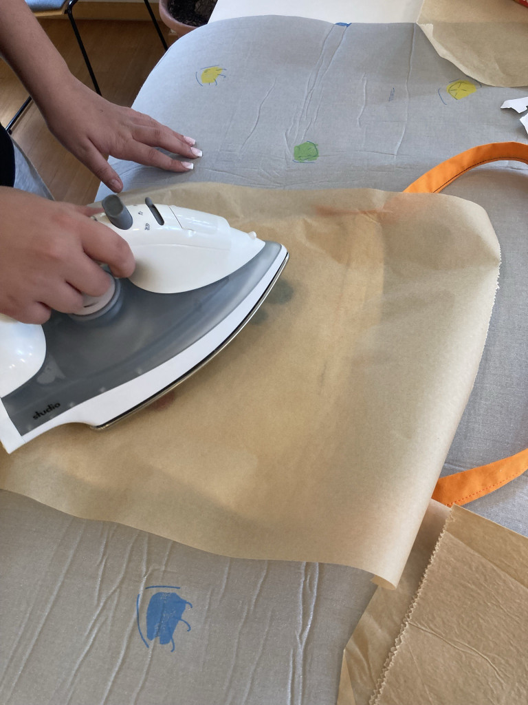 Das Logo des Ruckizucki-Treffs wurde auf eine spezielle Trägerfolie gedruckt. Die Kinder haben es dann ausgeschnitten und auf eine Jute-Tasche platziert. Mit großem Respekt vor dem heißen Bügeleisen wurde dann das Logo und einige kleine Motive aufgebügelt.