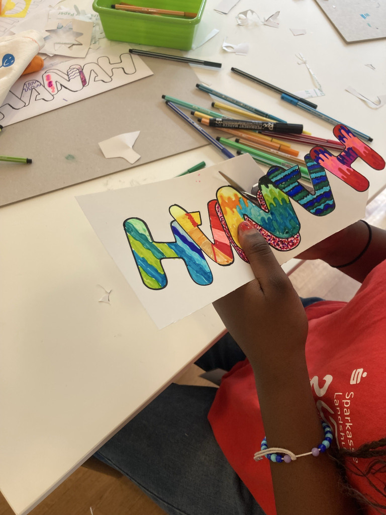 Dann galt es die Rückseite mit dem eigenen Namen zu gestalten. Mit Buchstabenschablonen und Neon-Filzstiften haben die Kinder Ihren Namen im „Graffiti-Style“ auf der Trägerfolie gestaltet und anschließend wieder aufgebügelt.