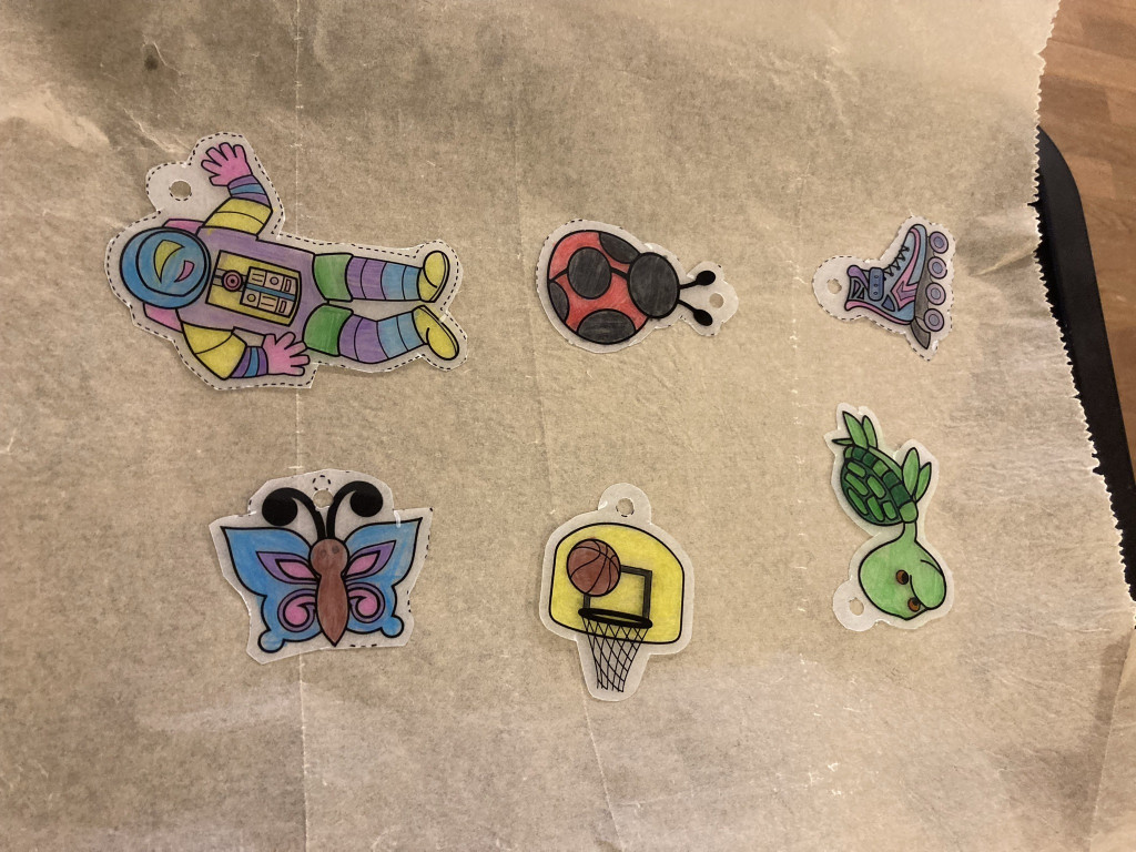 Es wurden Anhänger mit Schrumpffolie erstellt, Namen mit Buchstabenperlen auf bunte Trotteln gefädelt und bunte Anhänger mit Perlen und Bändern gefertigt.