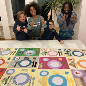 Jedes Kind hat bei jedem Treff die Gelegenheit seinen Essplatz einzudecken. Wo kommt das Besteck hin, wo das Glas und die Serviette? Ganz einfach ist das beim Ruckizucki-Treff, denn jedes Kind hat sein eigenes Tischset gebastelt und darauf ist die Anordnung des Gedecks abgebildet. Die Tischmitte wird immer saisonal und mit den gebastelten Werken des Tages geschmückt, dann wird ein Tischspruch aufgesagt und mit gutem Appetit geht’s ans Verspeisen der selbstzubereiteten Gerichte.